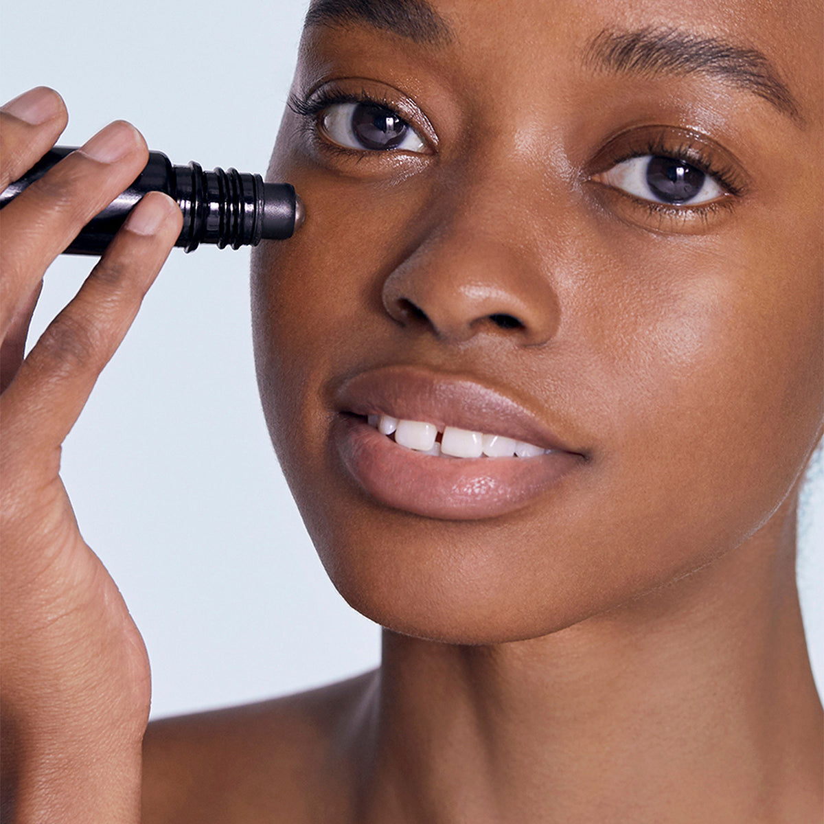- Place the cooling roller applicator underneath the middle of the eyebrow and roll to the outer corner of the eye and continue underneath in a half-moon shape.