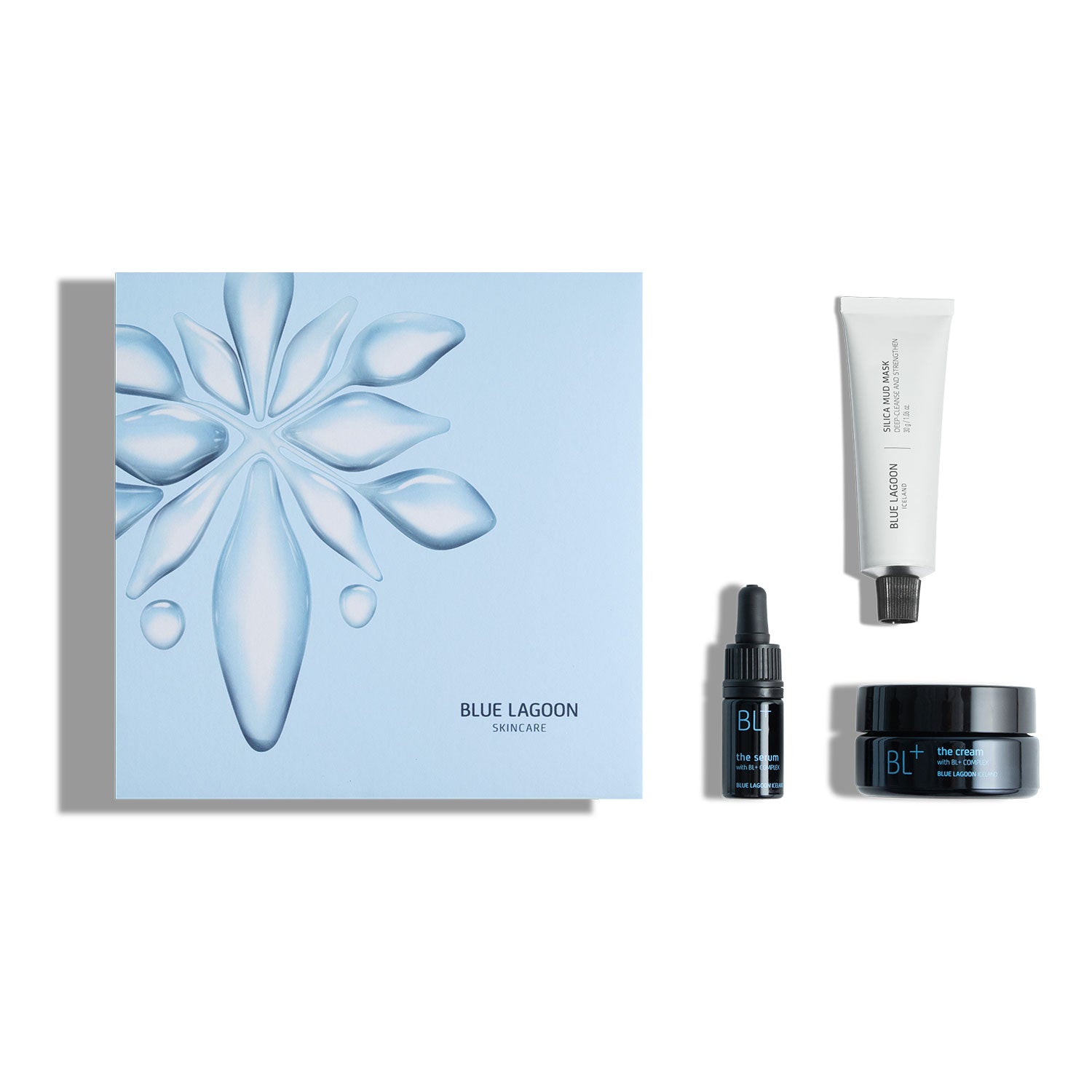 The set contains: BL+ The Cream (50 ml), BL+ The Serum (5 ml), and Silica Mud Mask (30 ml) with a pull string bag.